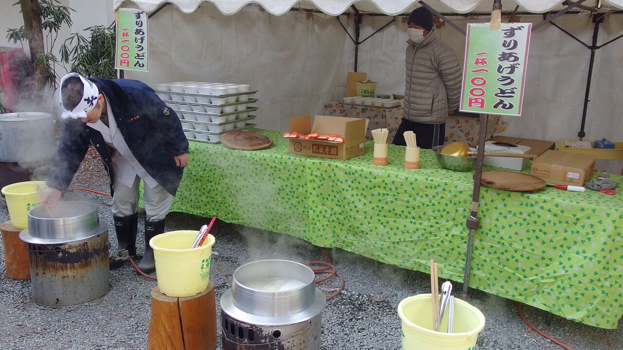 三峯神社の豆炒り神事で「ずり上げうどん」が振舞われていた。