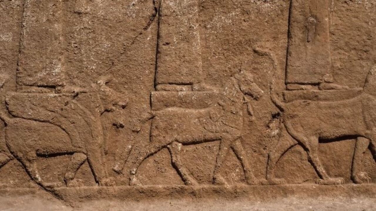 イラクの考古学者は、アッシリアの王が神話上の生き物の行列で彼の神に敬意を表する見事な岩の彫刻を発掘しました。